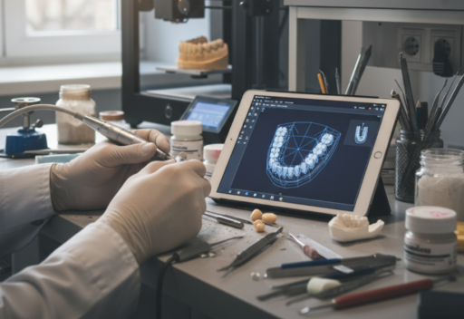 I dag begynder mange behandlinger med en digital 3D-scanning. I stedet for gipsaftryk modtager laboratoriet en fil, som tandteknikeren åbner i specialiseret software. Her designer vedkommende kroner, broer eller proteser digitalt, justerer formen i mikroskopiske detaljer og sender designet videre til fræsning eller 3D-print.
